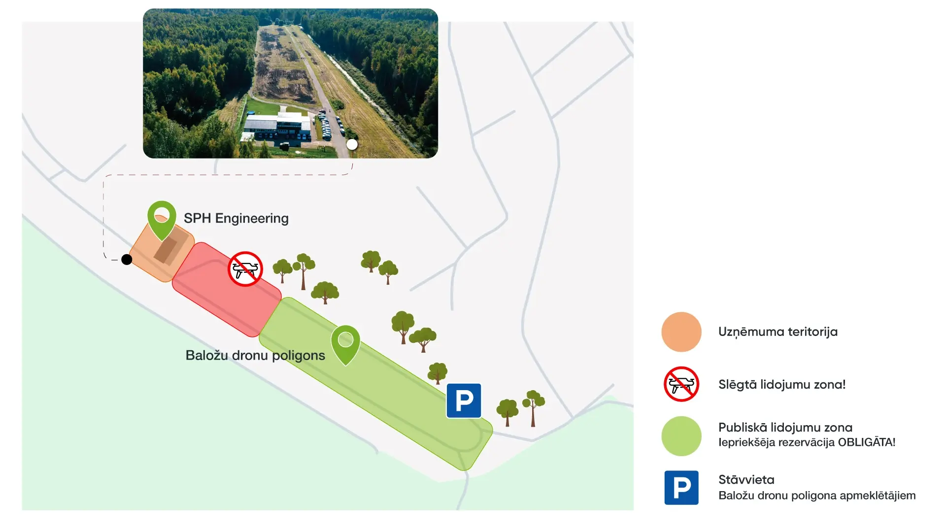 Poligonā iespējams reālos apstākļos testēt dronu un dronu pilotu spējas.